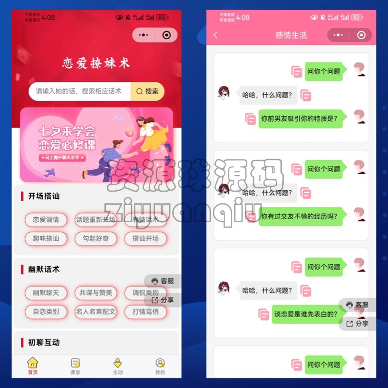 恋爱话术小程序微信恋爱话术流量主小程序聊天搭讪撩妹话术相亲交友 精品源码 免责声明:本站所提供的资源和内容部分来源于互联网及网友投稿,仅供学习和研究,请勿用于非法商业用途!如产生的任何法律纠纷与违法行为与本站无关!如有侵权请联系我们处理,敬请谅解! 购买产品的客户请勿涉黄或其他违反国家法律的用途上,如有客户不遵守国家法律产生相关法律问题与本站无关,我们不接触一切违反国家法律的技术支持工作,使用产品后请正确正规经营程序! 话术小程序