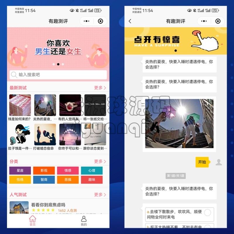 趣味测评小程序支持微信抖音小程序测评流量主小程序激励视频问卷小程序 精品源码 程序功能:测评功能/流量主/分享裂变/支持抖音微信小程序/提现功能等 免责声明:本站所提供的资源和内容部分来源于互联网及网友投稿,仅供学习和研究,请勿用于非法商业用途!如产生的任何法律纠纷与违法行为与本站无关!如有侵权请联系我们处理,敬请谅解! 购买产品的客户请勿涉黄或其他违反国家法律的用途上,如有客户不遵守国家法律产生相关法律问题与本站无关,我们不接触一切违反国家法律的技术支持工作,使用产品后请正确正规经营程序! 心理测评测评系统