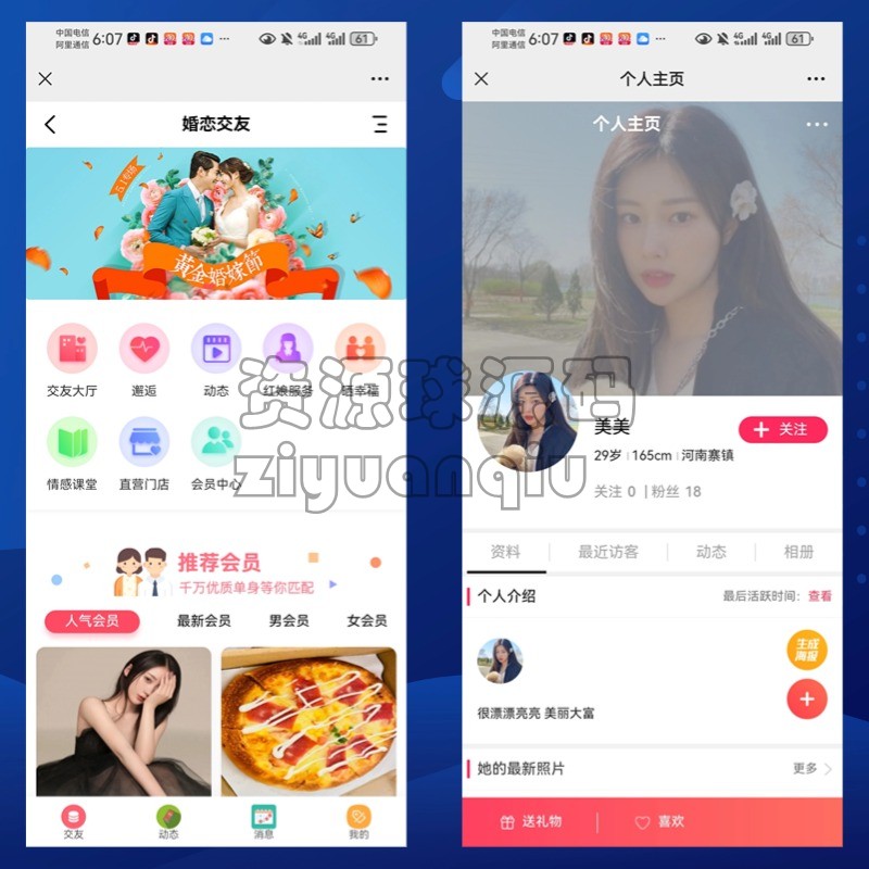 相亲交友小程序婚恋相亲同城交友婚恋红娘源码系统红娘功能 精品源码 相亲交友系统 包含H5,公众号,小程序端。 会员功能,红娘功能,聊天功能,多城市,活动功能,礼物功能等等 非常适合相亲交友的一套系统,功能齐全 免责声明:本站所提供的资源和内容部分来源于互联网及网友投稿,仅供学习和研究,请勿用于非法商业用途!如产生的任何法律纠纷与违法行为与本站无关!如有侵权请联系我们处理,敬请谅解! 购买产品的客户请勿涉黄或其他违反国家法律的用途上,如有客户不遵守国家法律产生相关法律问题与本站无关,我们不接触一切违反国家法律的技术支持工作,使用产品后请正确正规经营程序! 交友系统相亲系统