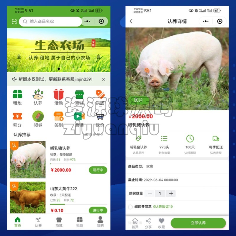 互联网智慧农场助农小程序共享认养实时监控商品溯源农业众筹积分商城小程序源码 精品源码 程序功能:商品功能/订单管理/积分商城/认养管理/卡券功能等 免责声明:本站所提供的资源和内容部分来源于互联网及网友投稿,仅供学习和研究,请勿用于非法商业用途!如产生的任何法律纠纷与违法行为与本站无关!如有侵权请联系我们处理,敬请谅解! 购买产品的客户请勿涉黄或其他违反国家法律的用途上,如有客户不遵守国家法律产生相关法律问题与本站无关,我们不接触一切违反国家法律的技术支持工作,使用产品后请正确正规经营程序! 众筹系统共享农场