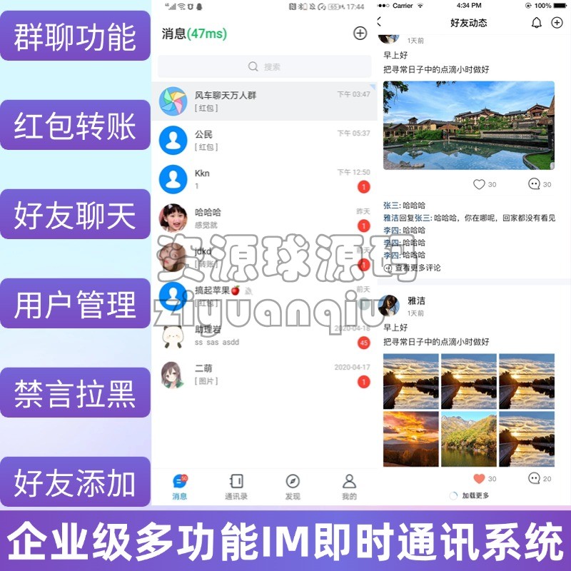 支持文字、表情、图片、语音、单聊、群聊、已读未读、消息群发、内嵌外链、签到、等完备的 IM 功能。